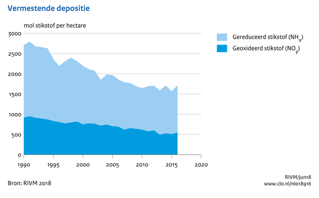 Zoals uit onderstaande grafiek blijkt, is de totale stikstofdepositie de afgelopen decennia gedaald. De daling is de laatste jaren afgevlakt. Dit komt onder andere doordat de ammoniakuitstoot niet meer daalde. Volgens de ‘Emissieramingen luchtverontreinigende stoffen Nederland – rapportage-2017’ van het Planbureau voor de Leefomgeving zal de totale uitstoot van stikstof (ammoniak en stikstofoxide) en daardoor de totale depositie van stikstof in de toekomst verder afnemen. Zie het RIVM-rapport voor een verdere toelichting.
